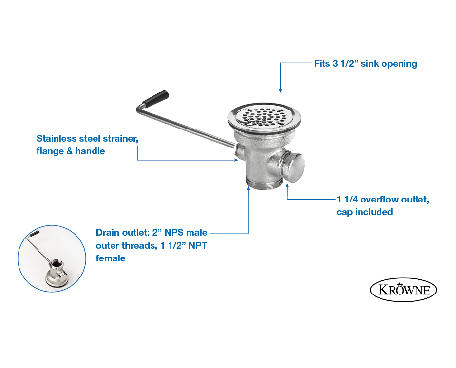 This twist waste drain is backed by a reassuring 3-year warranty, underscoring Krowne's commitment to quality and customer satisfaction. Whether you're upgrading your current setup or outfitting a new facility, the Krowne Royal Series 22-204-S is an indispensable piece of restaurant equipment that ensures efficient performance and reliability.