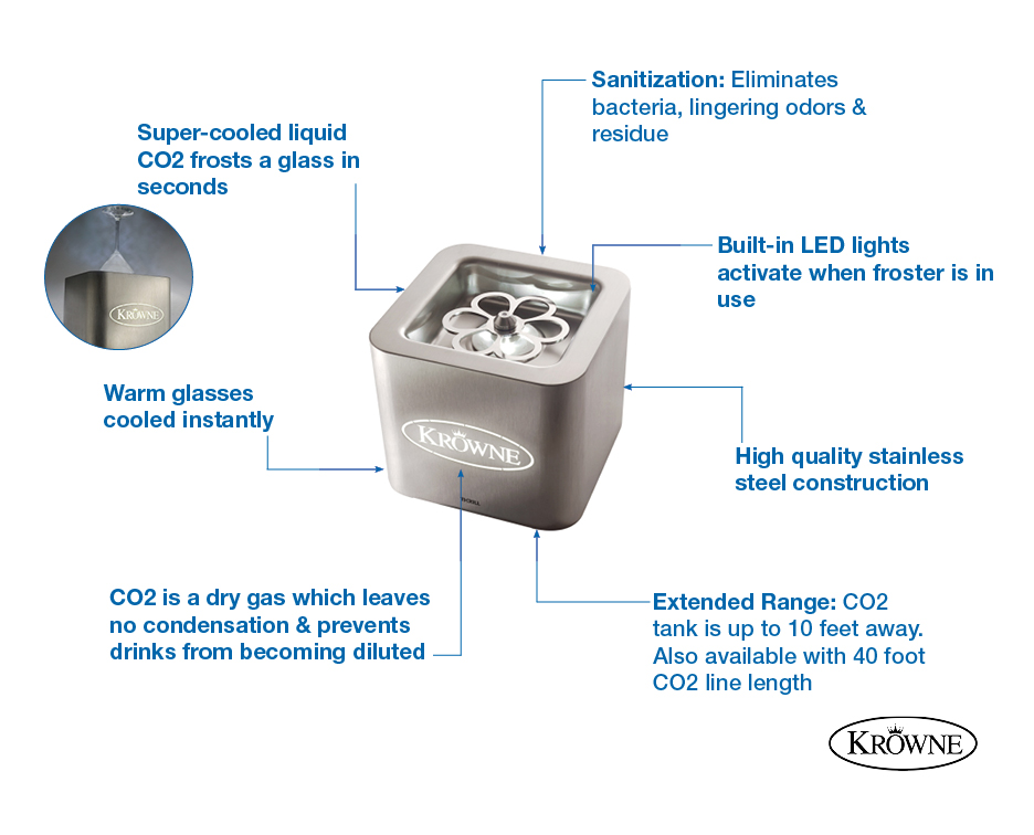 Krowne Royal Series Drop-In Liquid CO2 Glass Chiller, sanitizes, deodorizes & chills, built-in LED light, includes worktop mounting kit, stainless steel construction, 50 watts, 100-240v/50/60/1-ph, 10' CO2 Line, NSF (Recommended to use a dedicated 20LB aluminum CO2 cylinder with siphon tube (tank not included))