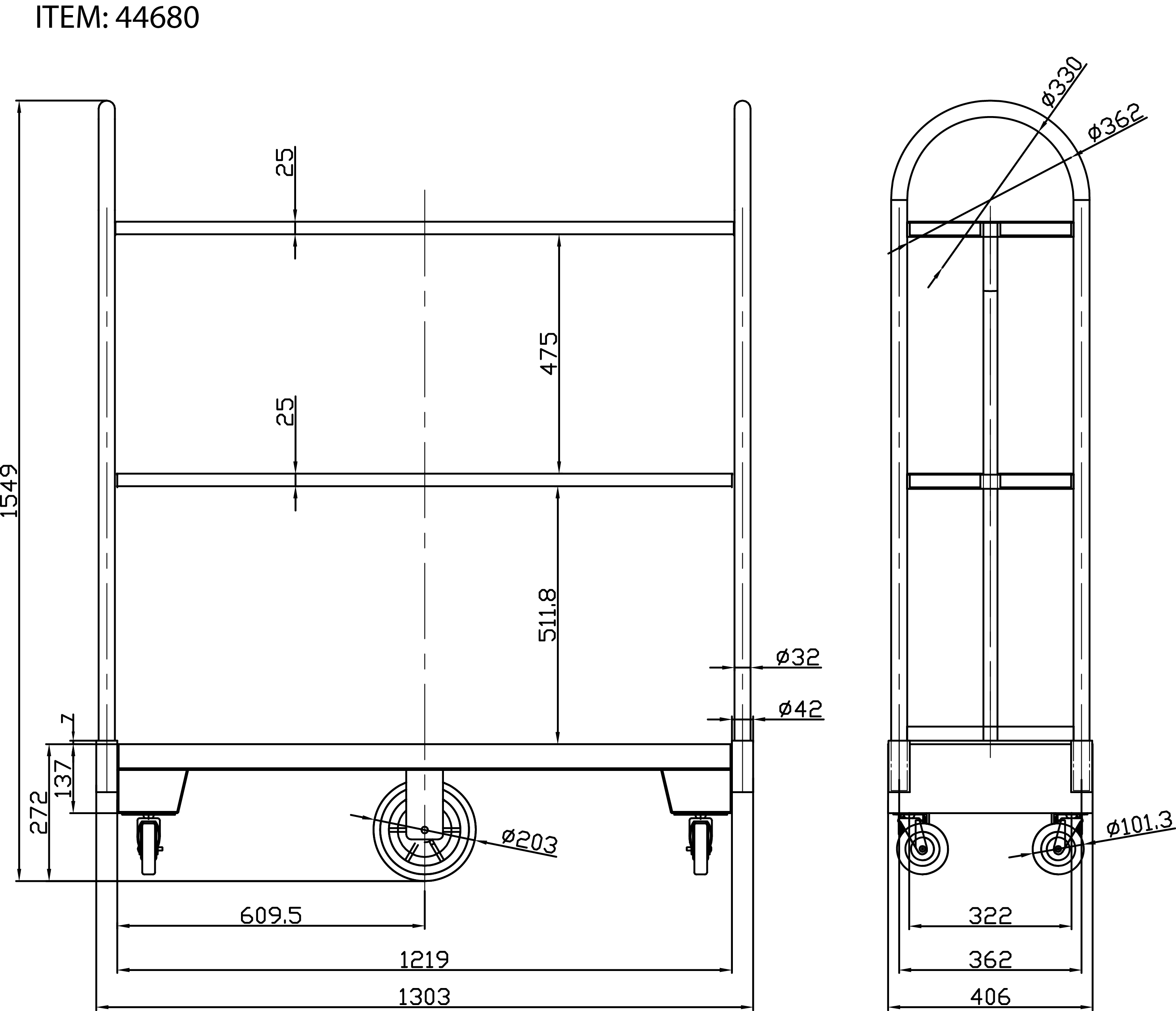 (44680) Utility Cart, 16" x 51", 1500 lb. load capacity, (2) shelves, steel construction, (4) casters, (2) wheels, (shipped on pallet)